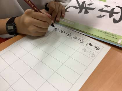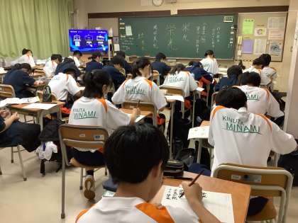 1年生は「栄光」2年生は「深緑」という文字の行書練習をしました。また、自分の氏名を行書で書きました。お手本の文字を見ながら、字形を整えようと取り組んでいました。