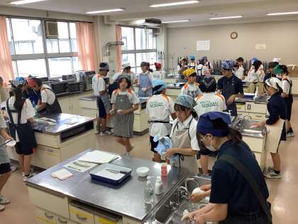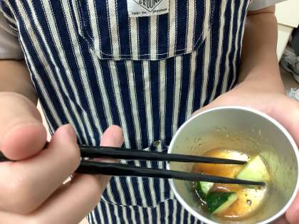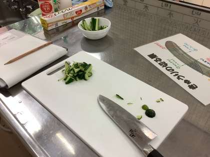 家庭科の授業で、野菜の切り方の実習を行いました。きゅうりで6種類の切り方を学びました。最後は美味しくいただきました。「きゅうり嫌いだったけど、食べられた。」という声も聞こえました。
