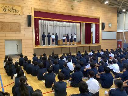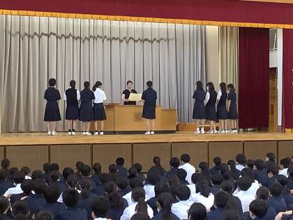 ソフトテニス部・吹奏楽部・水泳部の表彰がありました。おめでとうございます
