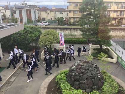 今日は「あいさつの日」でした。いつも「おはよう」の声が飛び交う正門ですが、今日はいつもより大きな声が上がっていました。教職員も玄関付近で見守っています。