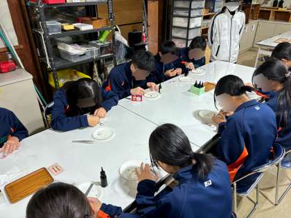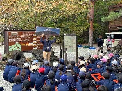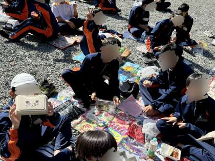 遅くなりましたが,フィールドセンターでの子どもたちの様子を共有します。写真は1枚目からフィールドセンターの方から溶岩樹型の説明を受ける様子,クラフト作りの様子,お昼ご飯の様子です。
