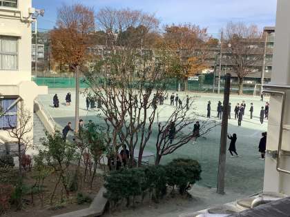 寒さに負けずに元気に校庭でボール遊びをしている生徒が多くいます。時には教員も参加して楽しんでいます。3年生の教室では、学習に取り組んでいる様子が見られました。