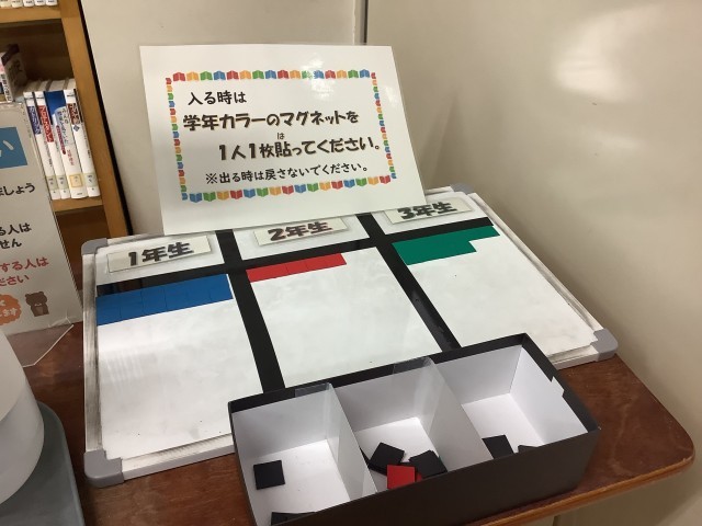学校図書館を利用した人の確認の仕方が変わりました。学校図書館に入ったら、自分の学年のマグネットを一つ、ホワイトボードにつけるようにして下さい。ご協力お願いします。