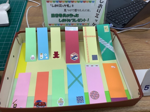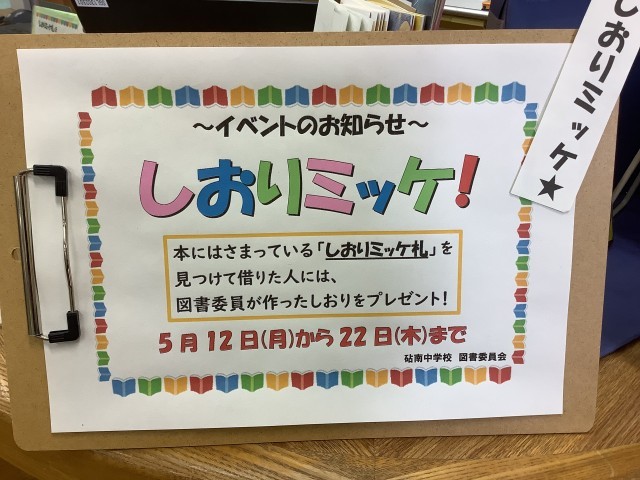 5月12日から22日まで、「しおりミッケ」イベントが始まりました。本(表紙裏)に「しおりミッケ」という用紙がはさまっている本を借りた人に、図書委員作成のオリジナルしおりをプレゼントします。ぜひ本を借りに来てください。