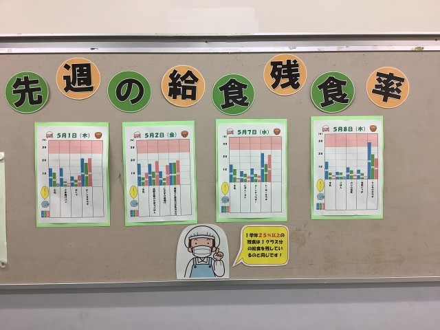渡り廊下に、学年ごとの先週の残食率の表が掲示されました。サラダの残食量が多いことがわかりました。