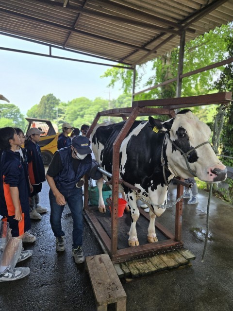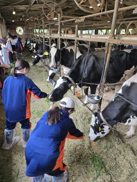 移動教室3日目は、酪農体験です。小林牧場さん、市の瀬牧場さんの二軒にお世話になり体験しています。酪農と牛の特徴の講話を聞いたあと、搾乳と餌やりの体験をしました。生徒は驚きと興味を持って体験しています。