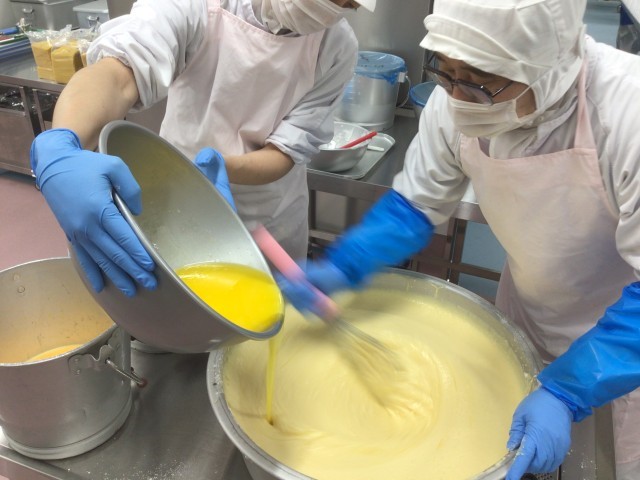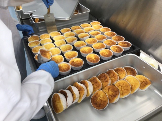 今日のデザートは、卵・小麦粉・バター・牛乳の生地にヨーグルトとレモンを入れたヨーグルトケーキです。給食ではカルシウムも高めるためにスキムミルクも加えて作りました。