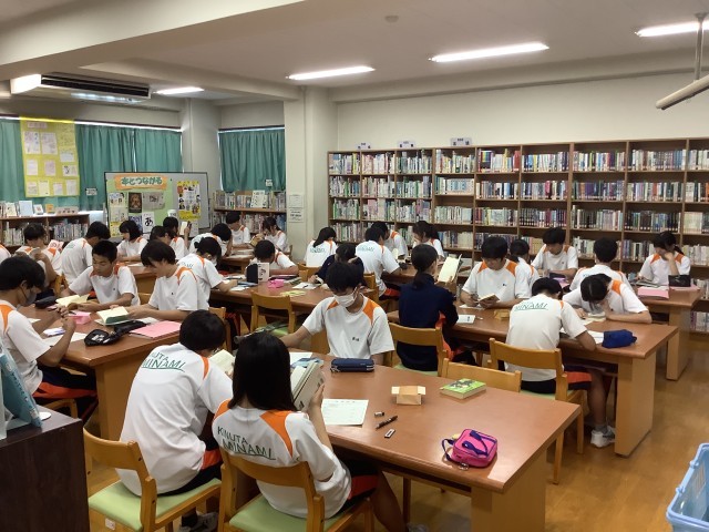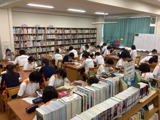 どの学年にも、読書単元があります。「本の世界を広げよう」という単元で、図書室での授業を行いました。司書と国語科教員の選んだ4冊(中学生が登場する小説・日本人作家の小説・外国人作家の小説・息抜きになる読み物)を5分ずつ読む「味見読書」をしました。今まで読んだことのない本を読むことで、本の世界を広げることができました。もっと読みたいと借りていく生徒もいました。