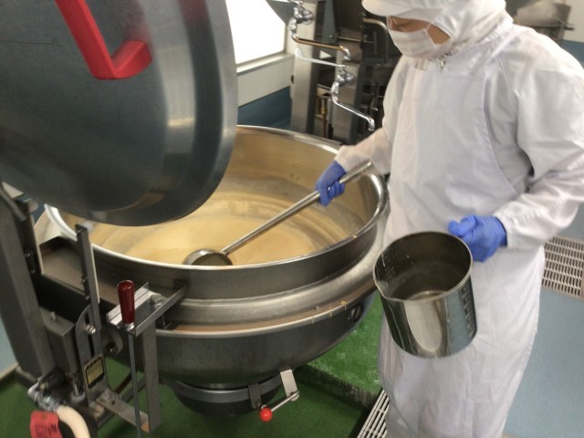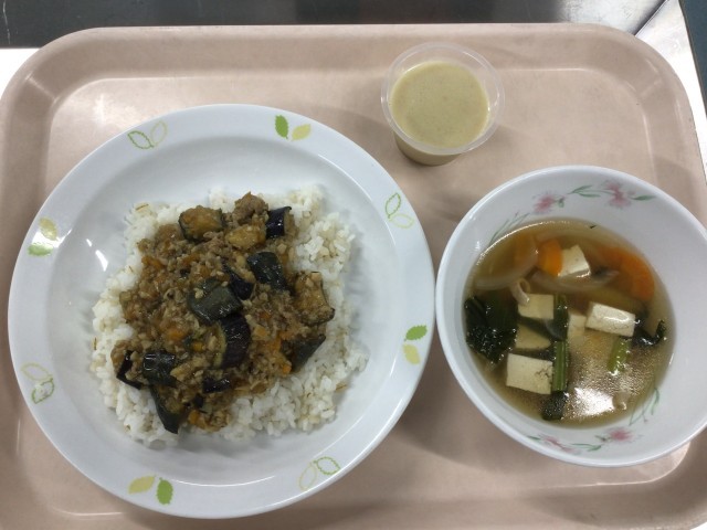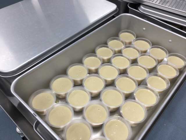 今日のデザートの白ごまプリンは、豆乳と練りごまを混ぜ甘く味付けをし、寒天液で固めて作りました。プリン液を作ったら、大きな計量カップでゼリーカップに1個1個流していきます。泡が入らないように丁寧に流したのできれいに仕上がりました。