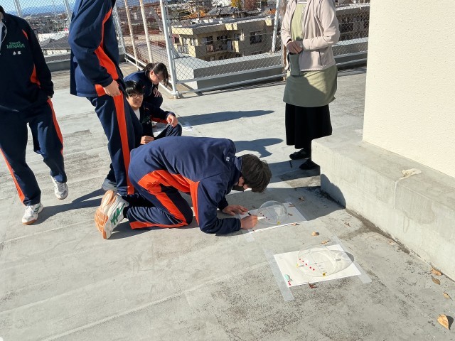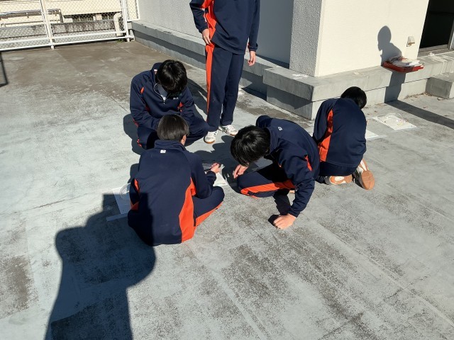 実際の太陽の軌跡を調べるために、屋上に装置を置いて、朝から放課後まで1時間毎に観測しました。