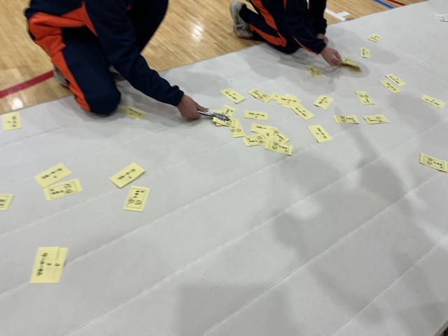 3年恒例の学年レクを行いました。今回はD組企画「サバゲー宝探し」でした。男女別のチームで協力しあい、クイズに答えてシール貼りの攻防を経て、点数を稼ぎました。