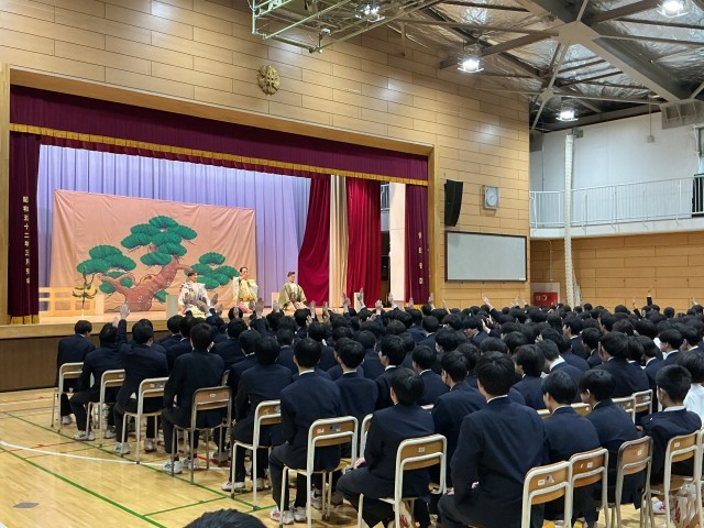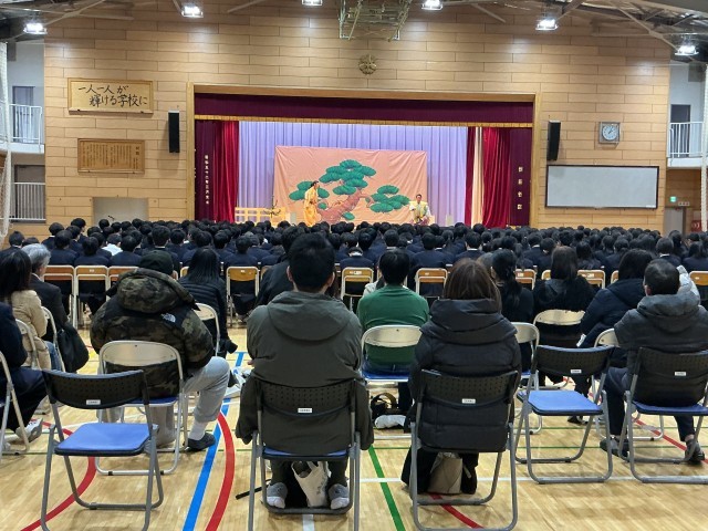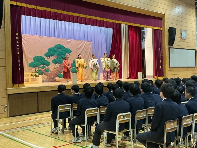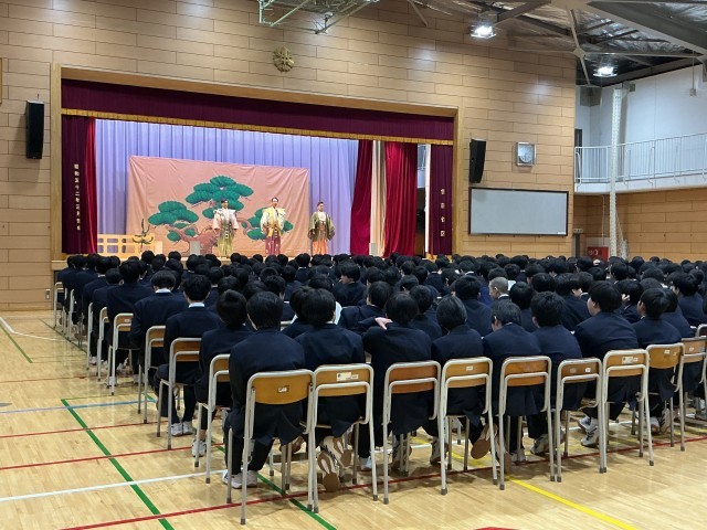 和泉流宗家の方々にいらしてただき、狂言の歴史や言葉の説明を受けました。次に「盆山」「仏師」を鑑賞しました。その後、狂言に出てきた言葉を発声して練習しました。最後にいただいた和泉流宗家の皆さんからのお言葉が大変心に響きました。