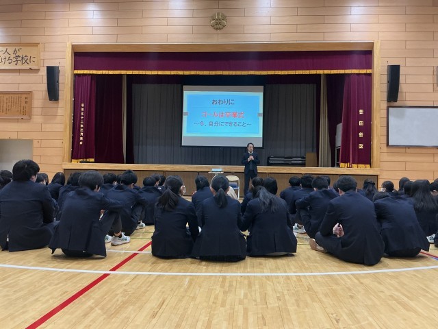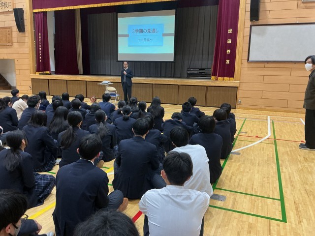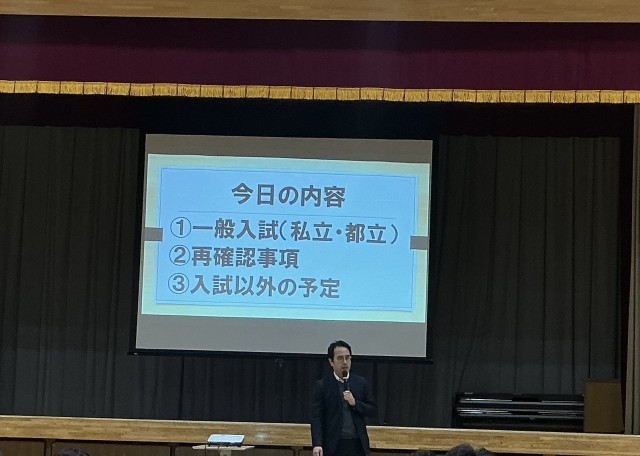 いよいよ受験シーズンになりました。学年集会で、Web出願などの流れの説明、受験日や発表日なども「すぐーる」で出欠席などの記入をすること、受験校・受験番号・合否などの報告を「ロイロノート」で行うことなど、学年主任と進路担当の先生から説明がありました。詳細は「進路だより」に書いてあります。しっかり確認しながら取り組んでください。応援しています。