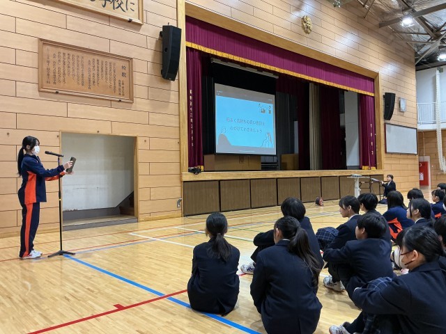 先週、3年生に取り組んでもらったアンケートをもとに、養護教諭が話をしました。心身共に健康に受験を乗り越えるための話で、「受験期を前向きに過ごす力をつける」「自分のストレスサインに気付く」「今日からできるストレス対処法を身につける」という内容でした。保健給食委員とともにストレッチ方法などを実践しました。