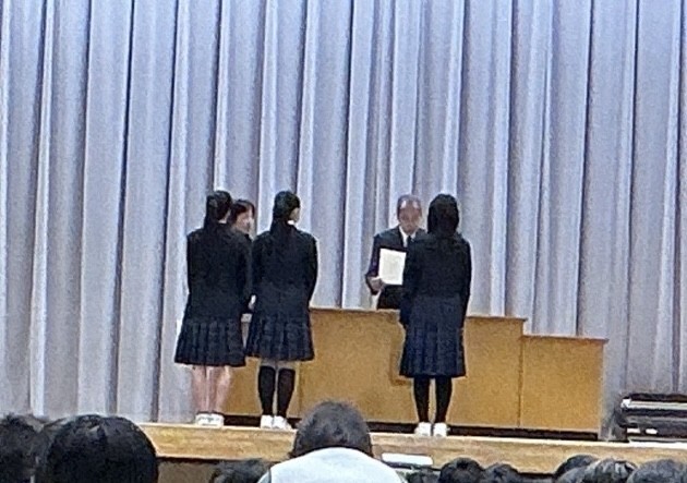 生徒会朝礼では、生徒会役員から挨拶運動・カジュアルデーに関する話がありました。その後、「明日のTOKYO作文コンクール」と「薬物乱用防止標語」の表彰がありました。薬物濫用防止の講演会実施と全校生徒による標語作りが評価され、「学校賞」も受賞しました。おめでとうございます。