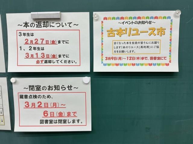 日頃よりご利用ありがとうございます。定例委員会後に図書委員の人から連絡されましたが、3年生は2月27日までに借りている本を返却してください。3月2日〜6日は蔵書点検のため閉館します。3月9日〜12日は古本リユース市を行います。学校図書館の廃棄本を希望者に渡します。期間中に学校図書館に来てください。