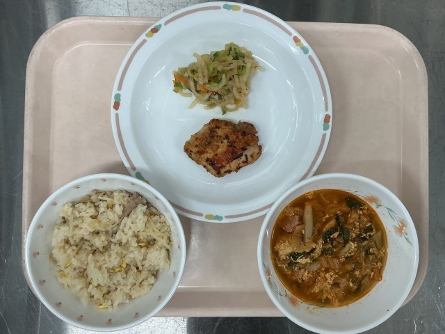 今日は韓国料理の献立です。コンナムルパブは豆もやしと豚肉の炊き込みごはんです。チゲは韓国の家庭料理で、キムチ味+みそ味でいただく鍋物に近い料理です。キムチに豚肉、豆腐、白菜、きのこ、ねぎなどを入れてコチュジャンで味付けしました。肌寒くなってきたこの時期にぴったりの汁物でした。