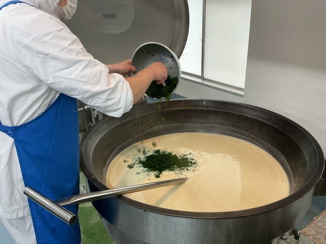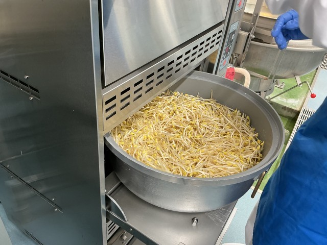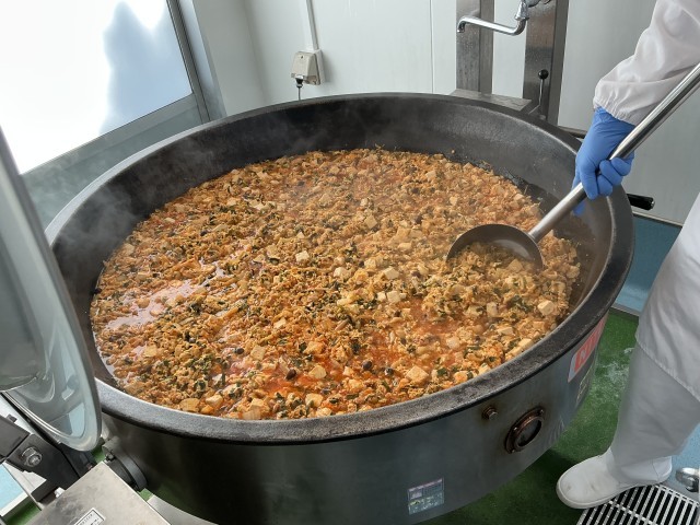 豆腐の五目炒めは、全校分で約70kgの豆腐を使います。豆腐の中心までちゃんと温まるように、豆腐だけで一度ゆでてから五目の具と合わせて作ります。