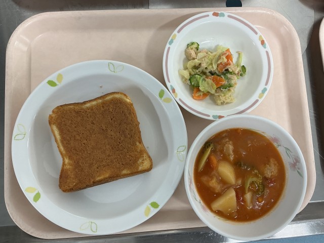 ボルシチはロシアで食べられる煮込み料理で、具だくさんの真っ赤なスープです。赤色の正体はビーツという野菜で、給食でもビーツを入れて作りました。冬の寒さが厳しいロシアでは、体を温める料理が好まれているそうです。