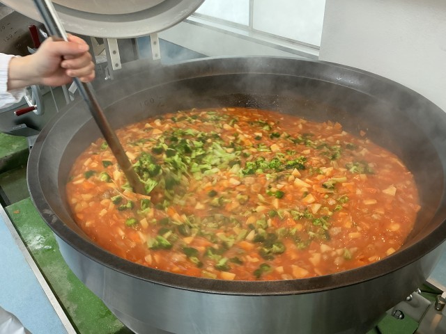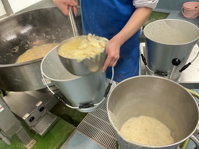 給食のハヤシライスは、豚肉とたまねぎをじっくり炒め鶏ガラスープと調味料を入れてよく煮込んだら、手作りのルウと生クリームを入れて完成です。茶色くなるまで炒めたブラウンルウが味の決め手となります。