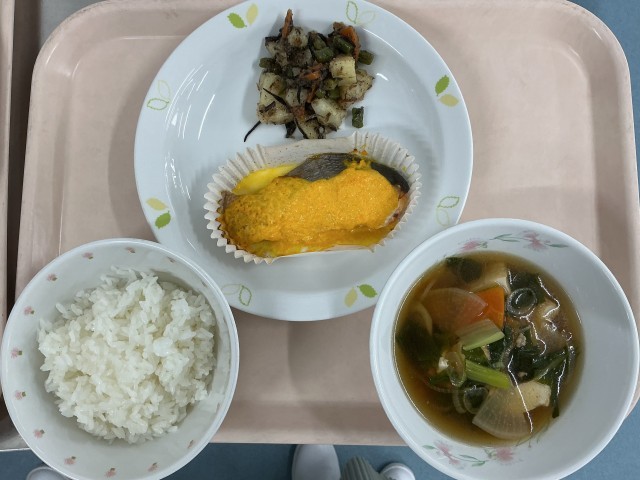 今日のごはんは有機米です。おかずは揚げたさばに大根おろしのタレをかけたさばのおろしかけです。白いごはんがよく進む味付けで、どのクラスもごはんはほとんど残っていなかったです。