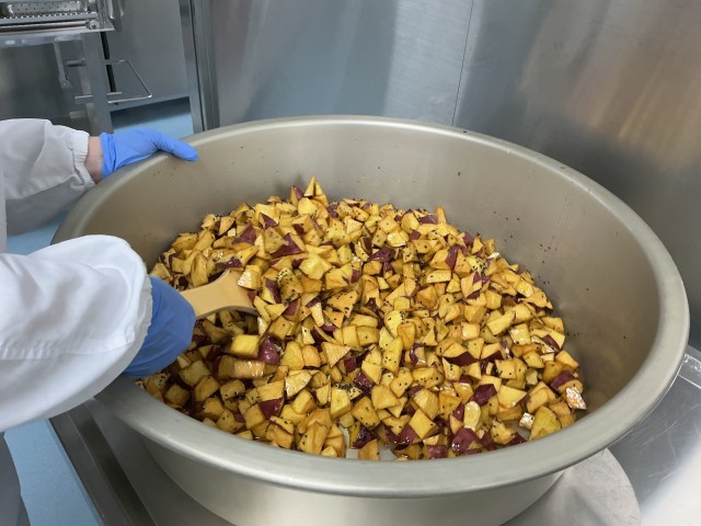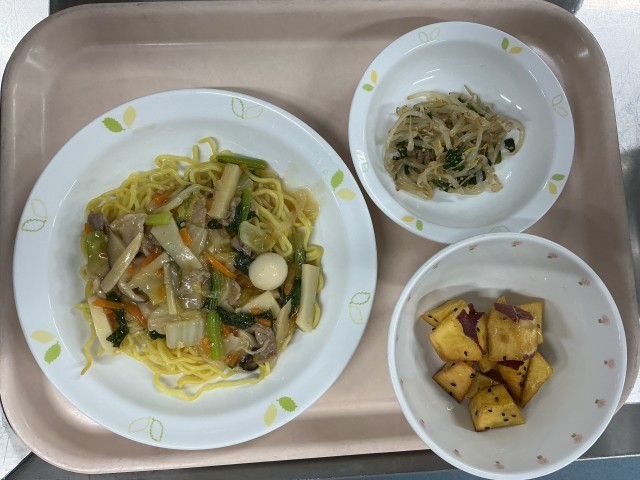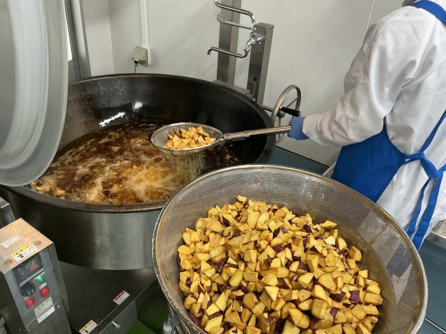 大学芋は、昔、東京大学の前で売り始めたところ大学生の間で大人気になったので、この名前がつけられたそうです。給食室でさつまいもをこんがりと揚げ、みつをからめてごまをふって作りました。外はカリカリ、中はホクホクに仕上がって、みんなよく食べていました。