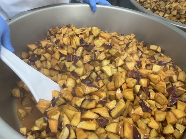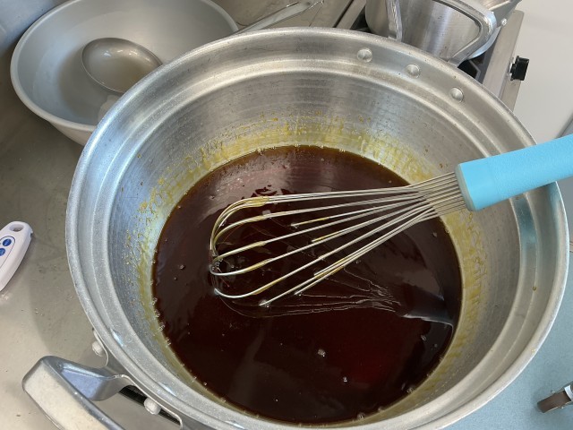 キャラメルポテトは、素揚げしたさつまいもにキャラメルソースを絡めた洋風大学芋のようなもので、キャラメルソースは給食室で手作りしました。砂糖を溶かして濃い褐色になるまで加熱してカラメル状になったら、生クリームを加えます。砂糖を焦がしすぎないように気をつけてつけながら作りました。