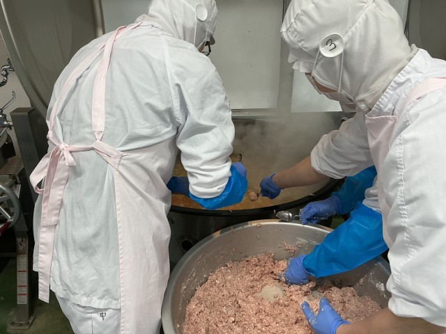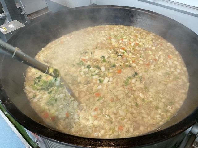みそ汁に入っている肉団子は鶏ひき肉に豆腐を入れて作ったので、とても柔らかい食感に仕上がりました。20kg近くある肉団子の生地を、釜の前で団子を作ってみそ汁の中に入れて行きます。全部入れ終わるまでに30分くらいかかりました。