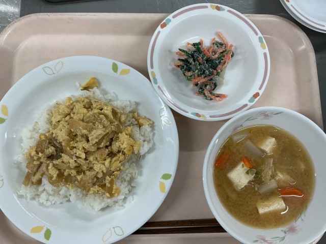 きつねどんぶりは、甘辛く煮た油揚げと玉ねぎを卵でとじてごはんにのせた料理です。給食では、釜で煮た油揚げの具と卵液を鉄板に流してオーブンで焼いて作りました。油揚げが入った料理を「きつね」と表現することが多いですが、これはきつねの神様の好物が油揚げだとされていることに由来するそうです。