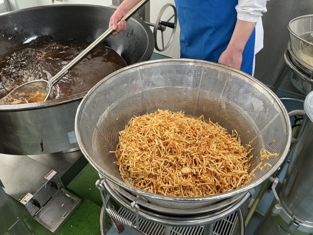みそ汁に入っている肉団子は鶏ひき肉に豆腐を入れて作ったので、とても柔らかい食感に仕上がりました。20kg近くある肉団子の生地を、釜の前で団子を作ってみそ汁の中に入れて行きます。全部入れ終わるまでに30分くらいかかりました。