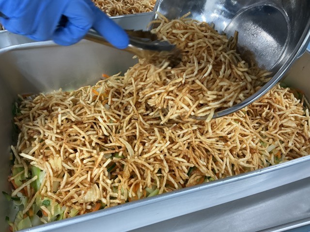 じゃがいものハニーサラダは、素揚げしたじゃがいもと野菜に、手作りのはちみつ入りドレッシングを混ぜ合わせて作ります。カリカリのじゃがいもが食欲をそそるとても大人気のサラダで、どのクラスもよく食べていました。