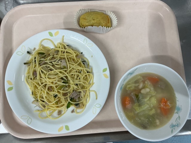 給食週間2日目は、昭和40〜50年代によく食べられていたソフト麺の献立です。ソフト麺は、正式には「ソフトスパゲッティ式めん」といい、学校給食用に開発された麺です。もともとパンしかなかった給食に新しい主食を、ということで開発されたものです。