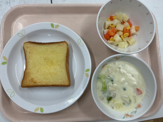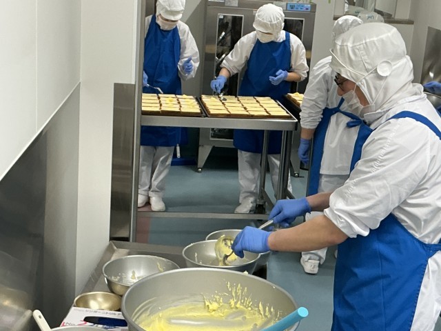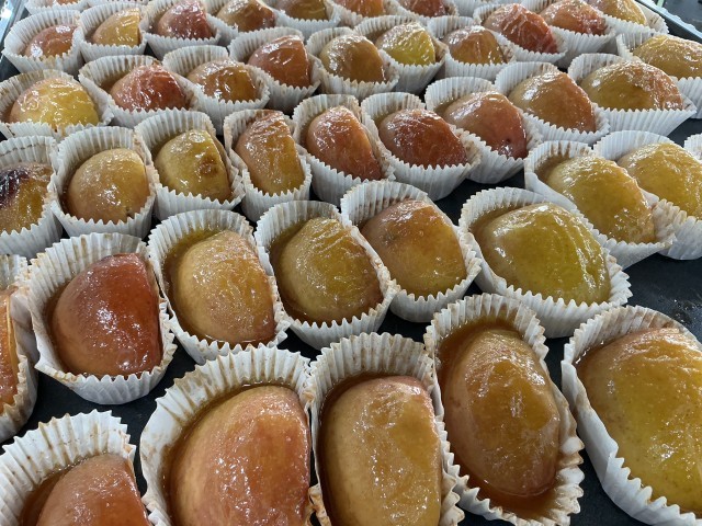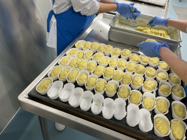 今日のデザートはスイートポテトです。朝一番にさつまいもを蒸してつぶし、砂糖やバター、生クリームを加えて小判形に成形しカップに入れてオーブンで焼きました。休みが多かったクラスもありましたが、残食はほとんどなく大好評でした。