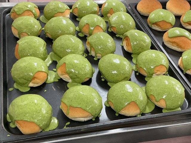 給食週間3日目はせたがやそだち給食です。世田谷で栽培された小松菜20キロを使いました。葉はやわらかくゆでミキサーにかけてペーストにし、クッキー生地に練りこんで焼いて小松菜ビスキュイパンに、茎はベーコンやきのこと炒めてホットサラダにしました。