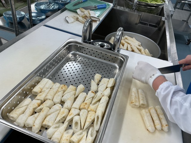 今日の肉まんは、小麦粉を練って生地を作るところから給食室で一つ一つ手作りしました。肉まんを作る作業はとても大変で時間がかかるため、ひと学年いない日にしか作れないスペシャルメニューです。