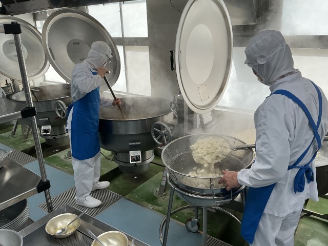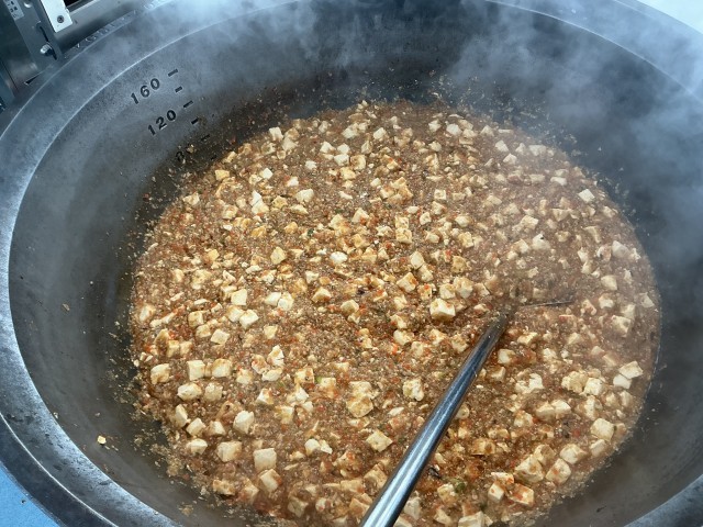 四川豆腐は中国の四川省を代表する豆腐料理で、麻婆豆腐の四川風というところです。全校で70kgもの豆腐を使って作ります。
