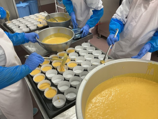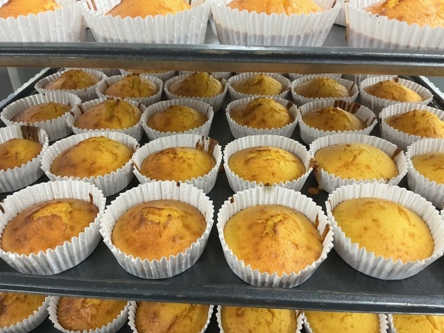 今日のデザートはキャロットケーキです。柔らかくゆでたにんじんをオレンジジュースと一緒にミキサーにかけ、卵やバター、砂糖、小麦時を混ぜ合わせて作りました。やさしい甘みのケーキに仕上がり、にんじんが苦手な子も食べやすかったと思います。