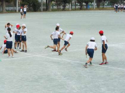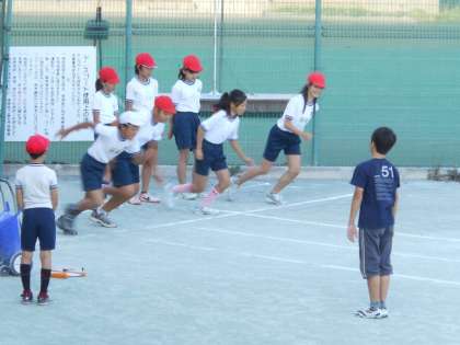 元気に100m走やリレーのバトンパスの練習をした後、そろって