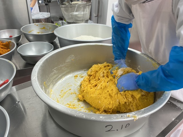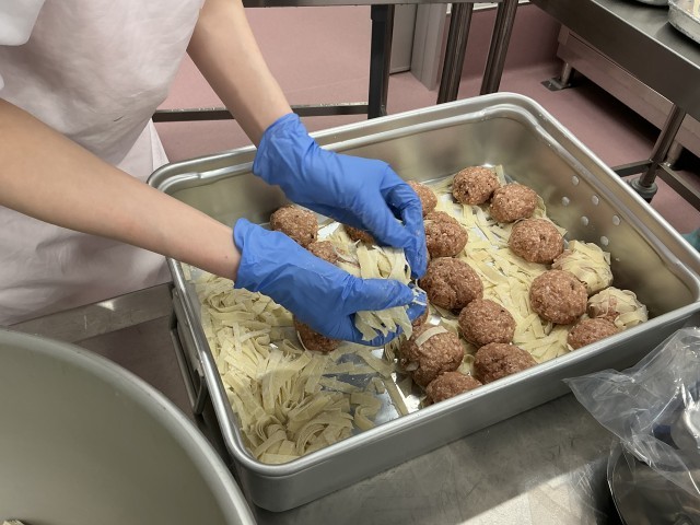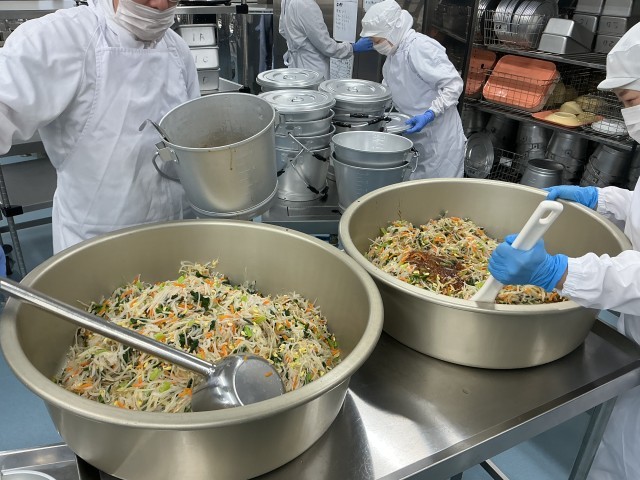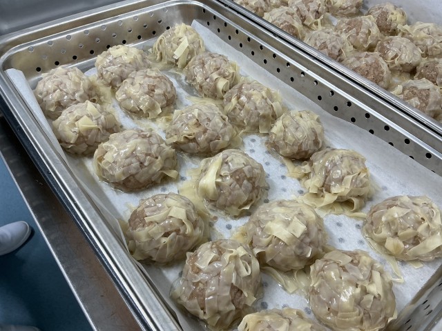 今日のしゅうまいは学年閉鎖になった1年生の分の材料をキャンセルできなかったので、肉だねを1人1.5倍の量に分割し、しゅうまいの皮を短冊に切って肉だねを包んだ花しゅうまいにしました。とても大きなしゅうまいになりましたが、残はほとんどなくみんなよく食べてくれていました。
