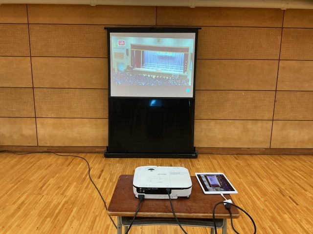 生徒たちは開会式前に発声練習をしました。今年は、格技室でお待ちいただいている間に体育館の様子がわかるように、スクリーンを用意しました。