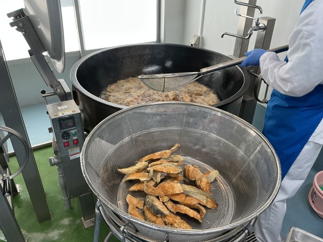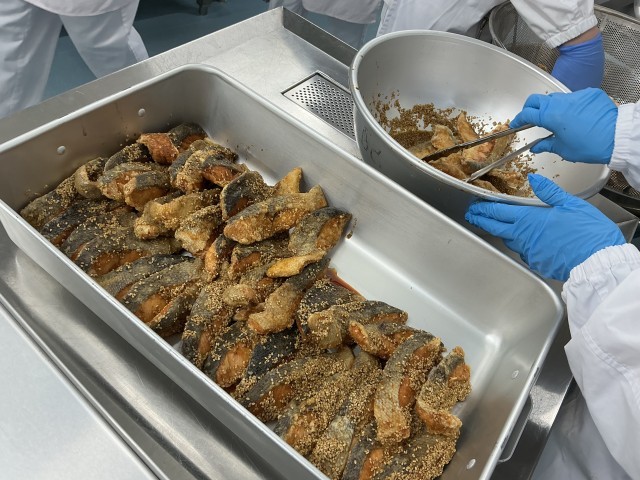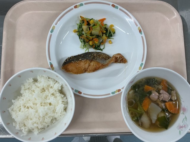 鮭の照りごま揚げは、でん粉をつけてカラリと揚げた鮭を、にんにく風味のごまだれにくぐらせました。今日から1年生が学年閉鎖となり鮭がキャンセルできなかったため、1年生分のを2.3年生に振り分けたのですが、半分のクラスは完食でどのクラスもよく食べてくれました。食材を無駄にしないで済んだのでよかったです。