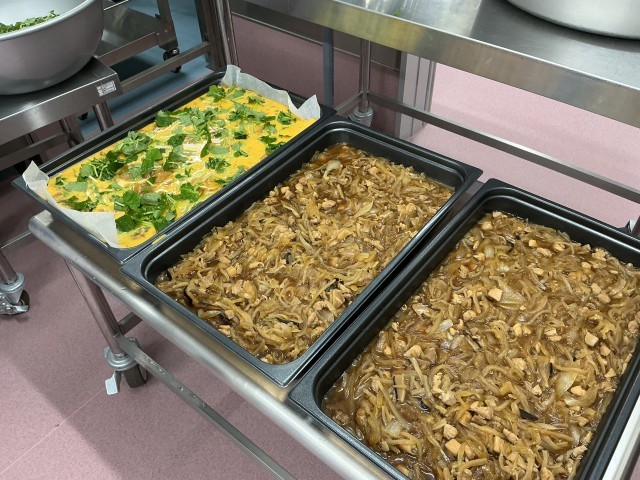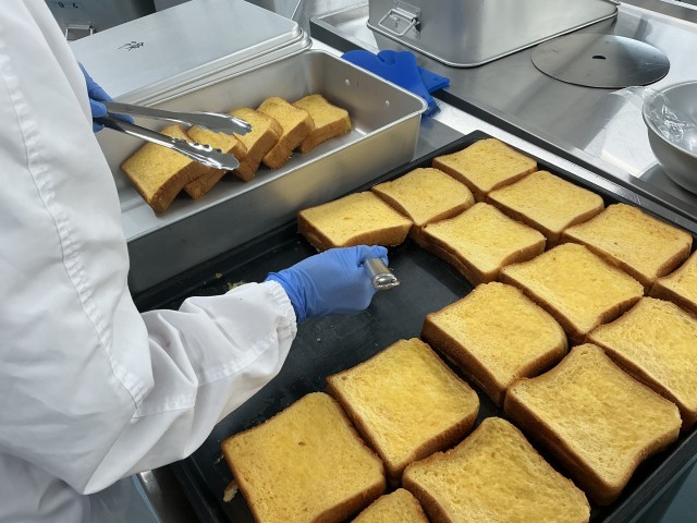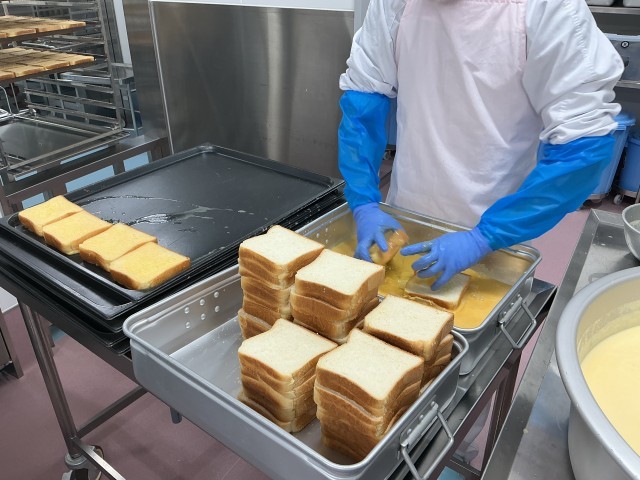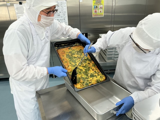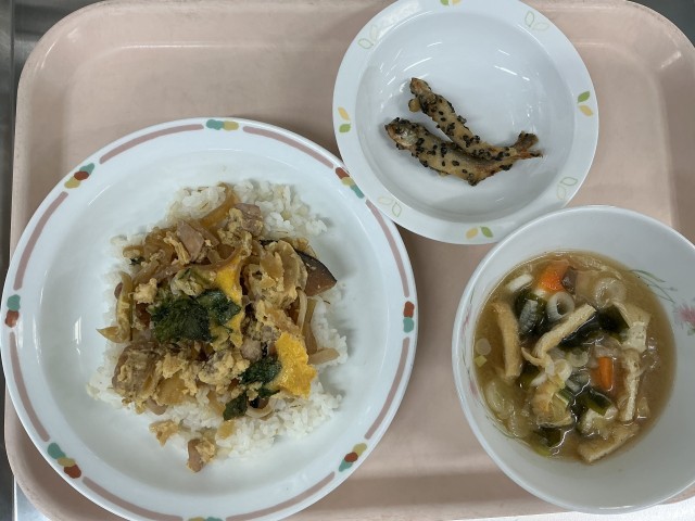 今日は親子丼です。給食では卵を完全に火を通して提供しなければならないため、具を煮ただし汁と卵液を合わせてオーブンで焼いて作り、教室で一人分ずつすくって配膳してもらいました。