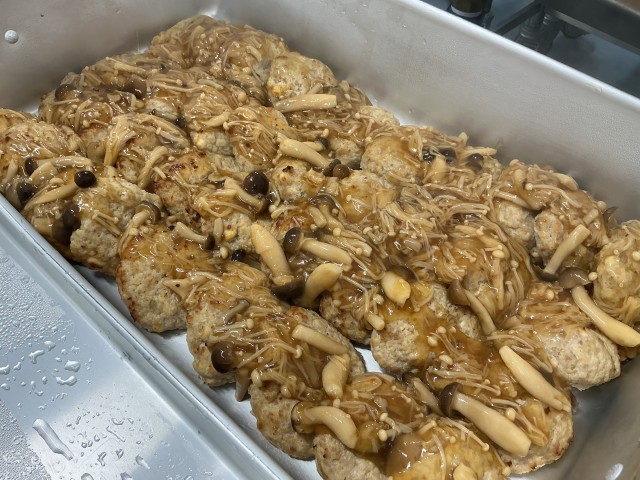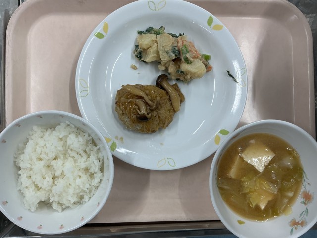 ハンバーグ生地は、豚ひき肉に豆腐と凍り豆腐も混ぜて作りました。焼き上がりにきのこソースをかけて秋らしい献立になりました。