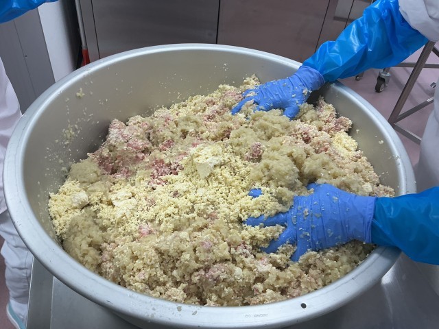 給食のハヤシライスは、豚肉とたまねぎをじっくり炒め鶏ガラスープと調味料を入れてよく煮込んだら、手作りのルウと生クリームを入れて完成です。茶色くなるまで炒めたブラウンルウが味の決め手となります。