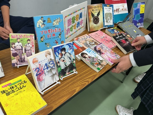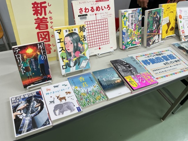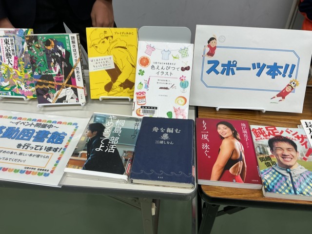 昼休みに渡り廊下で「移動図書館」を行いました。多くの生徒と先生が本を見に来ていました。学校図書館にもぜひ来てください。