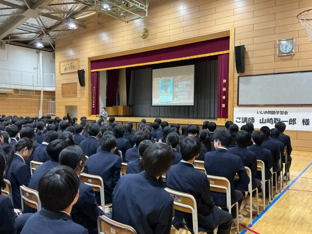 11月19日(水)に、「子ども六法」の著者である山崎聡一郎さんをお招きして講演をしていただきました。公益財団法人東京都人権啓発センターを後援とした「人権問題学習会 いじめ問題学習会」です。「いじめを認める強さを身につけよう」というテーマで、ご自身の体験談を交えて、中学生に考えて欲しいこと・これから取り組んで欲しいことを語ってくれました。