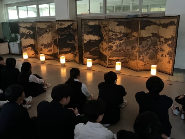 2年生が「平家物語」の学習をした後に、国立博物館の方をお招きして、平家物語の屏風の読み取り方など魅力を教えていただきました。当時の人が見ていたように、行燈の灯りで見たり太陽光で見たり、色々な鑑賞の仕方も学びました。