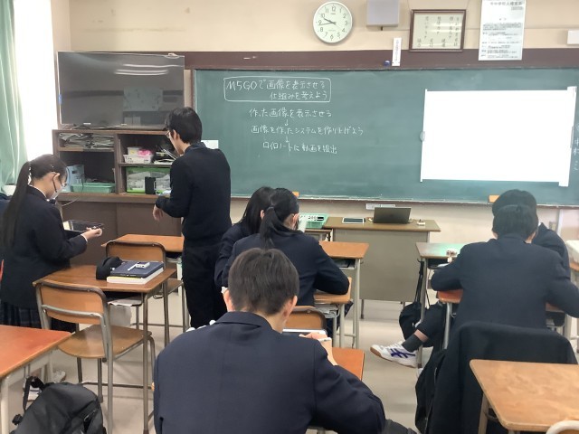 技術科では、M5GOで画像を表示させる仕組みを考える授業を行いました。自分の考えた画像を作ったシステムを作り上げていました。