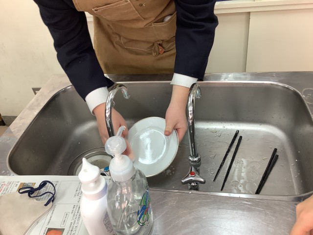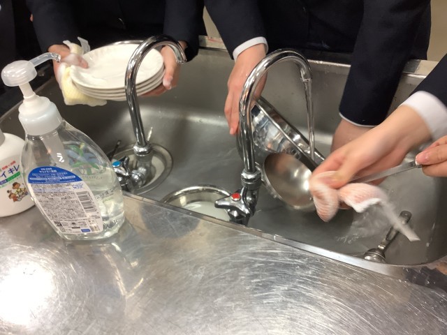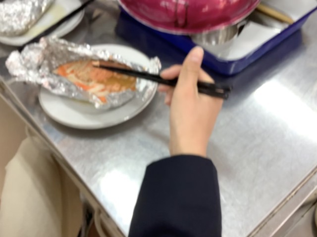2年生の家庭科で、鮭のホイル蒸しを作りました。班員で協力して作りました。片付けもしっかりできていました。