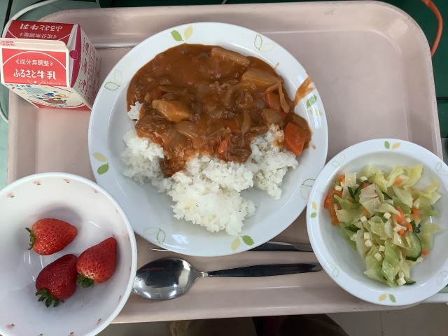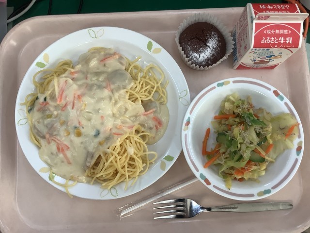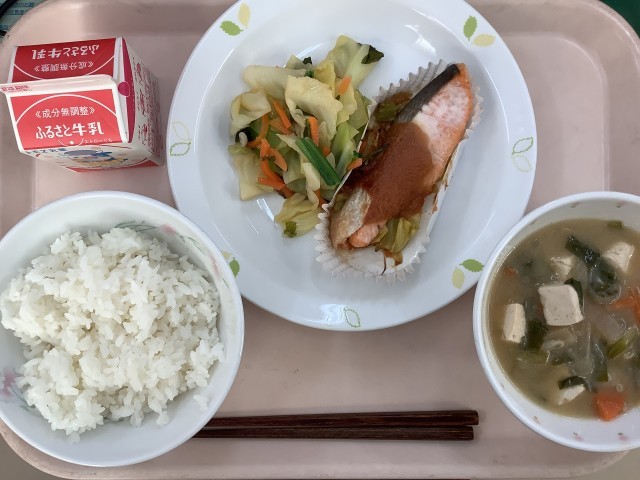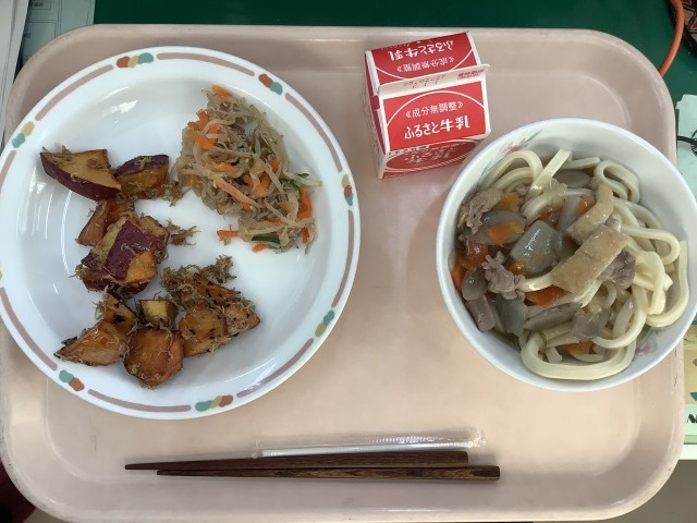 本日のメニューは、けんちん汁・かみかみあえ・大学芋・牛乳でした。毎日美味しいメニューをいただいています。